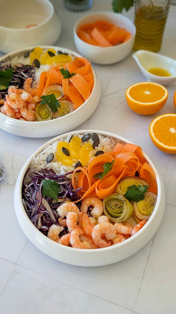 Ce bowl hivernal aux crevettes associe des légumes de saison rôtis et crus, la douceur de l’orange et des crevettes bien charnues, pour un repas complet, léger et ultra gourmand.