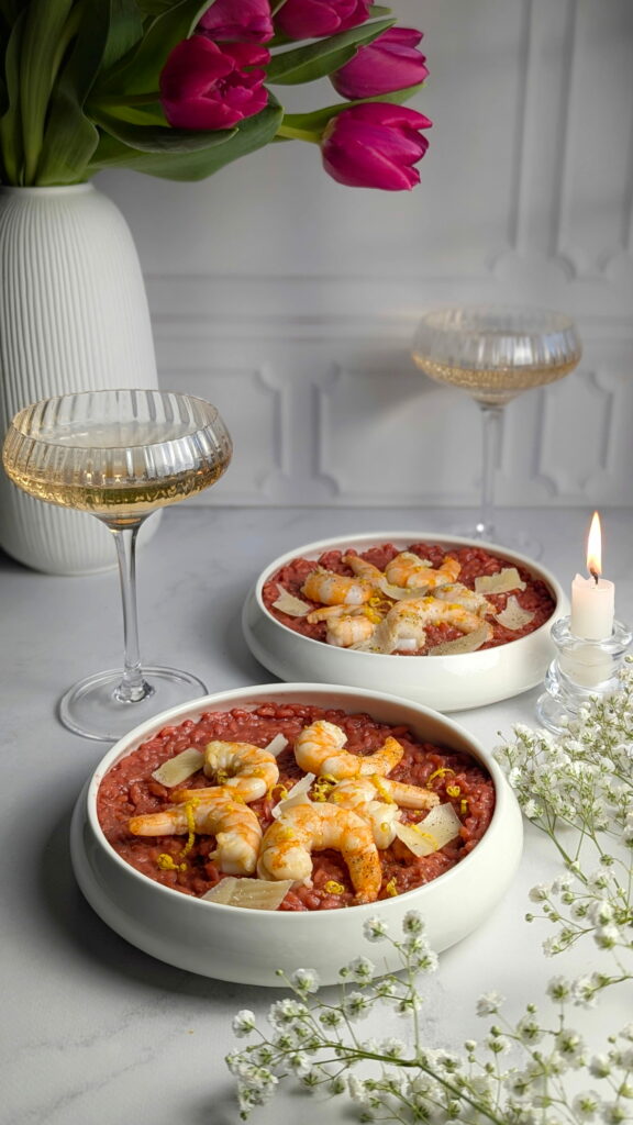 La betterave apporte une teinte naturellement rosée et une texture ultra crémeuse, tandis que les gambas viennent relever le tout avec finesse. Faciles et rapides à préparer, elles s’intègrent parfaitement dans ce risotto original, idéal pour un repas à deux qui en met plein les yeux.